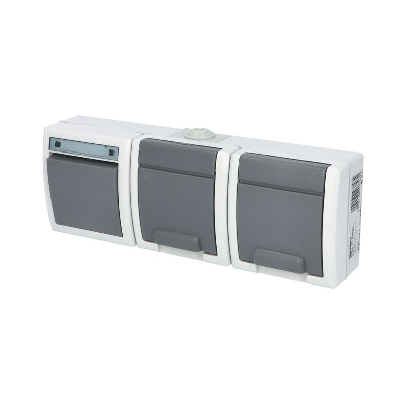 ATLAS *19094 IP55 Přepínač č.6 + zásuvka 2x 2P+PE, 2-násobná vodorovně s ochr. kolíkem, na povrch, šedý.