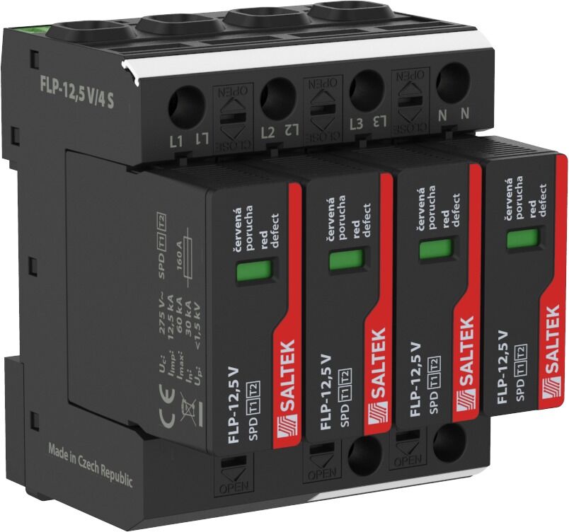 Saltek FLP-12,5 V/4 S svodič bleskových proudů a přepětí, vhodné pro 3-fázový systém TN-S, instalace na vstupu do budovy, 240 kA(8/20), 50 kA (10/350), dálková signalizace poruchy