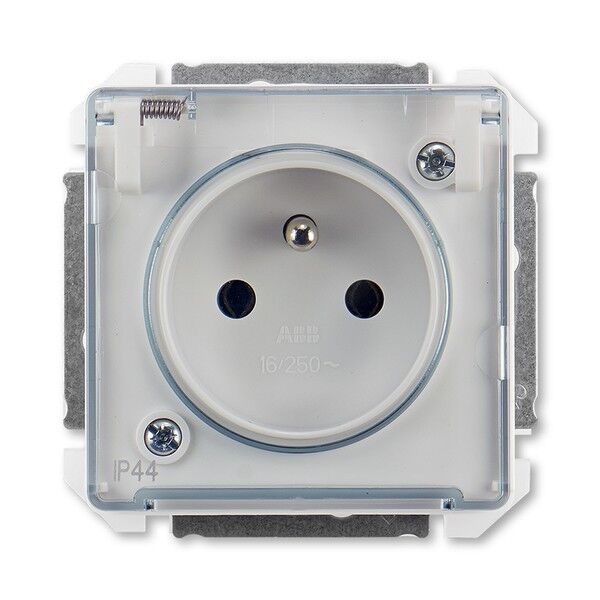 Zásuvka jednonásobná s clonkami a víčkem, s drápky, IP44; bílá (průhledné víčko) Vhodné pro designy z vypínačových řad ABB : G,J Objednací číslo : 5518G-A02989 B1